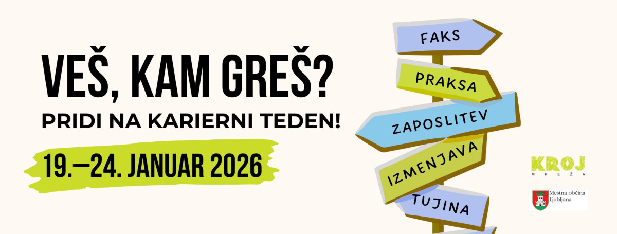 Karierni teden, ki poteka med 19. In 24.1.2026, mladim ponuja tudi spletno karierno klepetalnico in podporo preko družbenih omrežij ter individualna karierna Zoom-svetovanja, kjer bodo mladinske karierne svetovalke z s tabo razmišljale o tvojih potencialih in možnostih nadaljnjega izobraževanja, usposabljanja ali iskanja primerne zaposlitve.